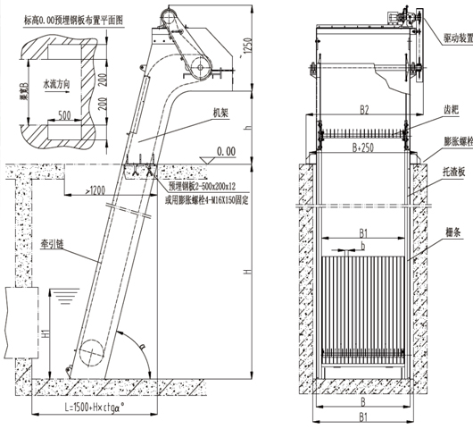 由于耙齒的特殊結(jié)構(gòu)形狀,使耙齒鏈攜帶雜物到達(dá)上端反向運(yùn)動時,前后耙齒產(chǎn)生相對自清運(yùn)動,促使雜 物依靠重力脫落,設(shè)備后面可設(shè)置旋轉(zhuǎn)的清污刷,進(jìn)一步除凈滯留在耙齒污物,如需要定貨時需注明。
